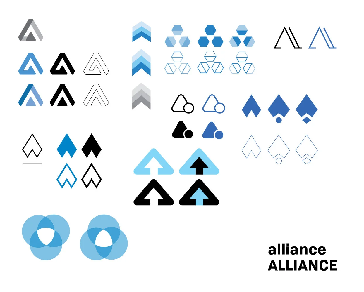Logos of preexisting cryptofunds and cryptocurrencies were either very literal, often depicting a literal coin, or very conceptual, circles with lines connecting them. I wanted to create a logo somewhere in between these two ideas, and eventually decided to ground the logo to the shape of the A for Alliance. This lent itself to triangular shapes, and eventually arrows, to represent growth.